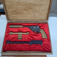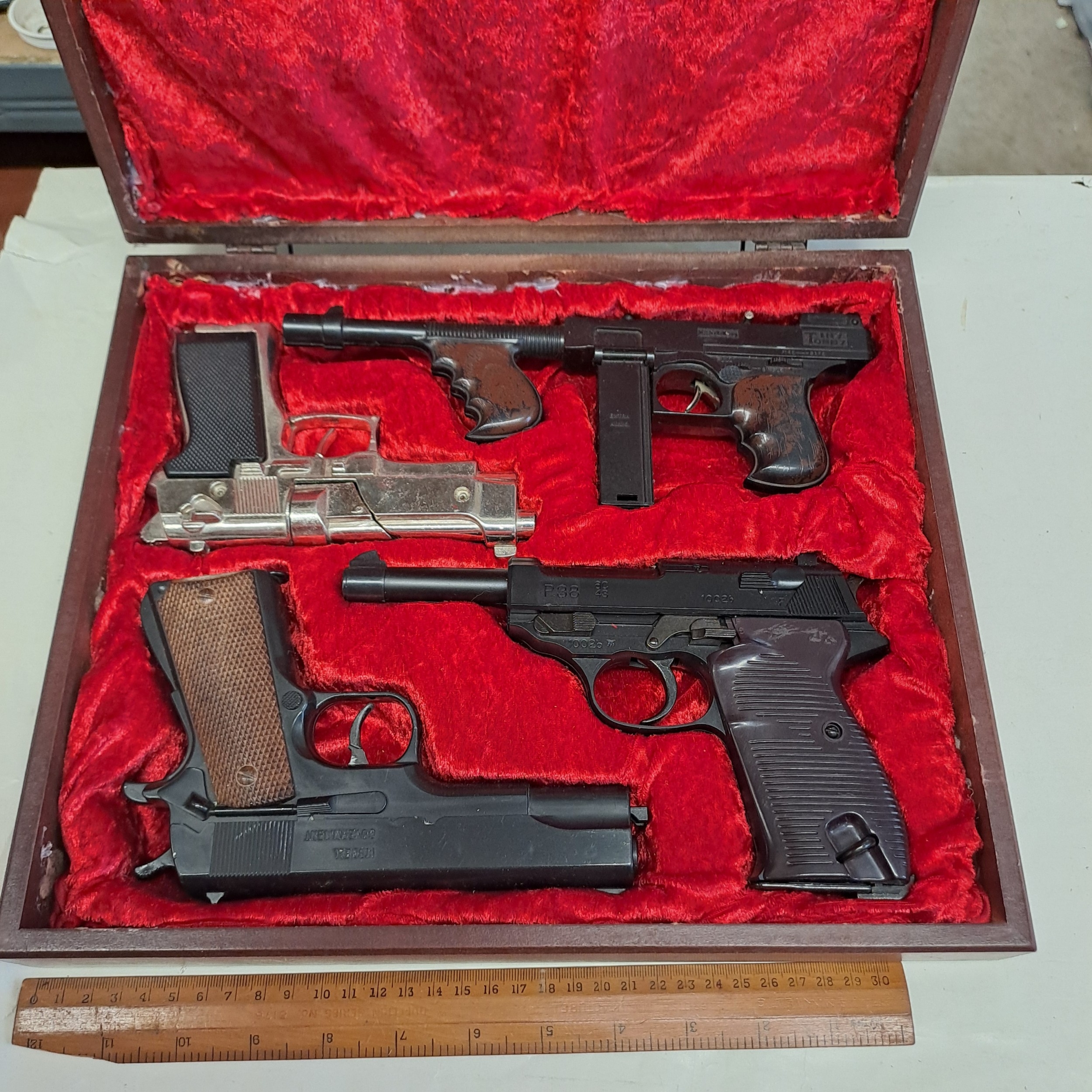 VINTAGE TOY AND CAP GUNS - P38 TINY TOMMY AND OTHER HAND GUNS CONTAINED WITHIN A CUSTOM MADE WOODEN CASE